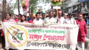 দৈনিক তালাশ ডটকম: ঢাক-ঢোলের তালে, নাচ-গান ও বর্ণাঢ্য শোভাযাত্রার মধ্য দিয়ে আনন্দঘন পরিবেশে ১৪৩৩ বঙ্গাব্দকে স্বাগত জানিয়ে বাংলা নববর্ষকে বরণ করেছে নারায়ণগঞ্জবাসী।